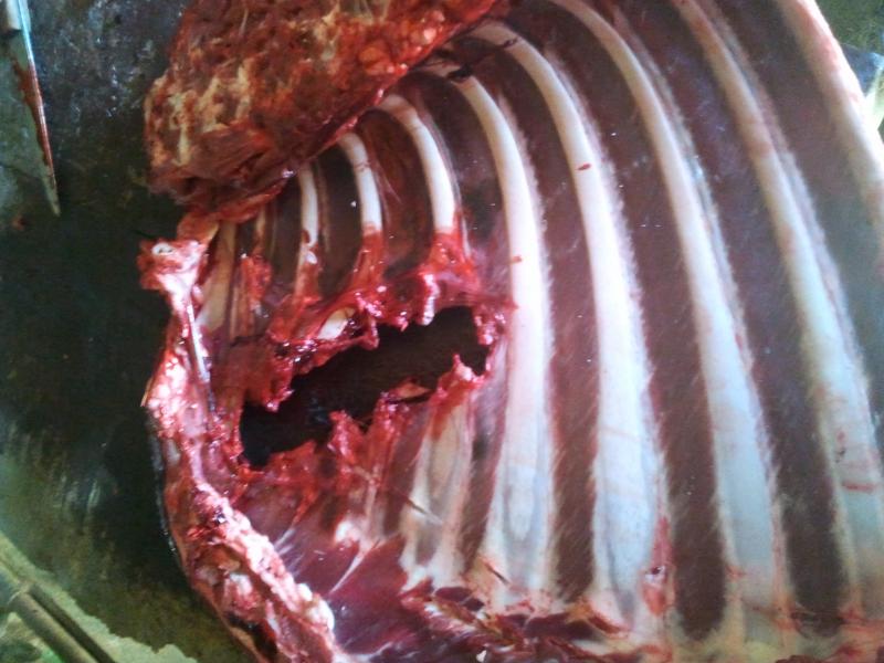el caso es que los agujeros eras identicos alos de entrado poco mas grandes ,cuando le quitamos la piel el primer tiro le habia roto 2 costillas y pinchado ambos pulmones el proyectil no habia trabajado nada de nada el segundo similar ya que en ese caso no alcance hueso pero por suerte una vena .