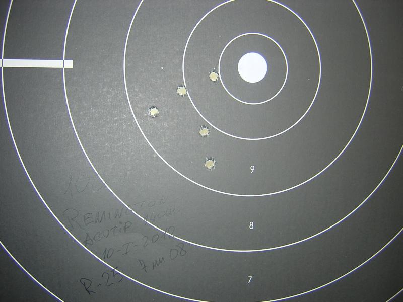 Bueno tampoco es para tanto, a 50 m. cualquiera. Vamos a por los 100m. Cargamos 5 cartuchos de remington accutip (son los que mejor coeficiente balistico tienen) vamos alla. Resultado: 60 mm. entre los centros mas lejanos. P.M. "me cagen".