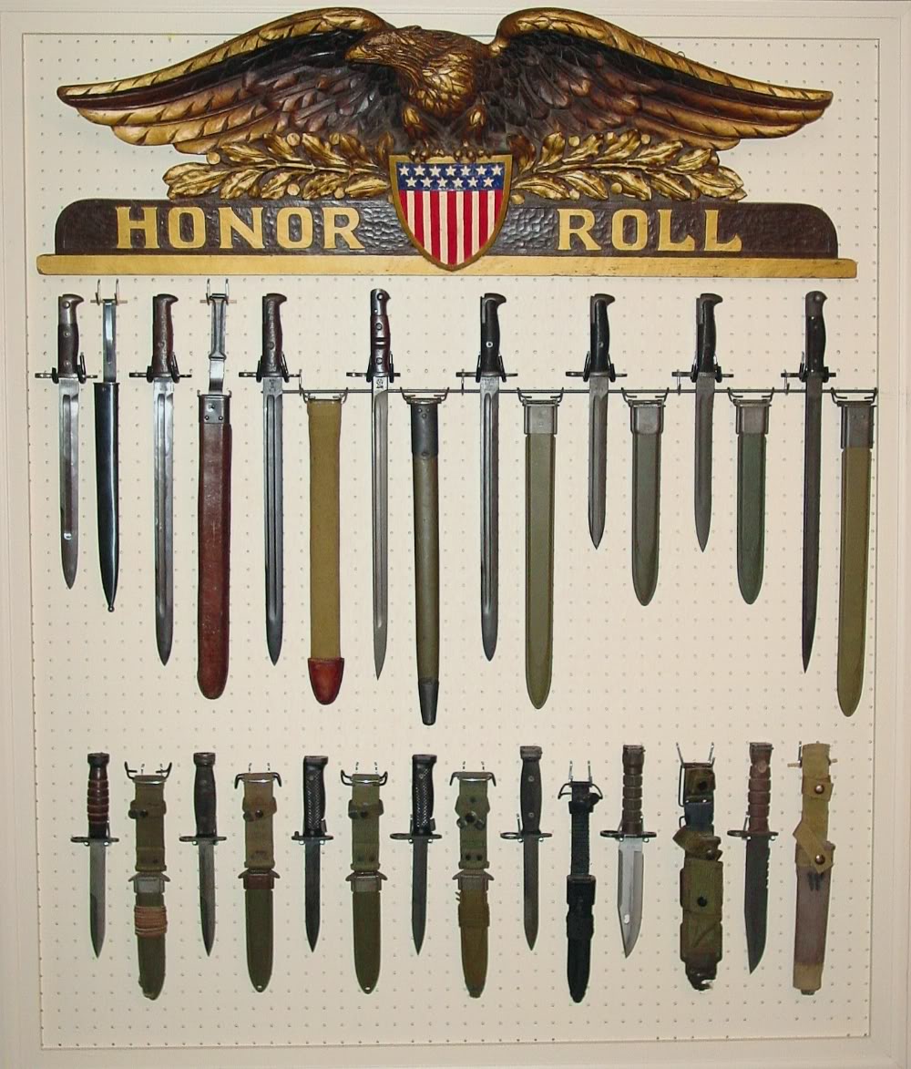 Hola, colecciono bayonetas y machetes españoles y busco ideas para fabricarme un expositor. Tengo intención de exponerlas en la pared, sobre una especie de marco con un fondo de tela rojo. En total quiero exponer unas 12 bayonetas con sus respectivas fundas o vainas.