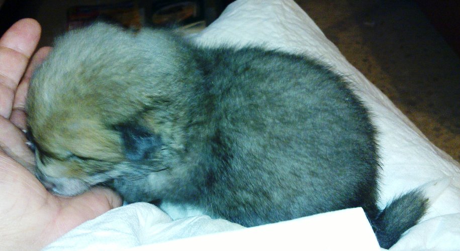El caso es que aún tiene los ojos y los oídos cerrados. Pero creo que muy pronto abrirá, primero los oídos (según me explicó la persona dueña de la pareja de zorros, padres de Goupi) y poco después los ojos.