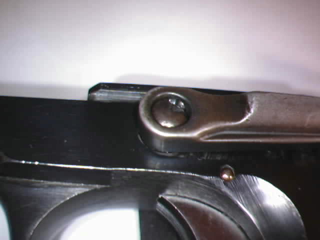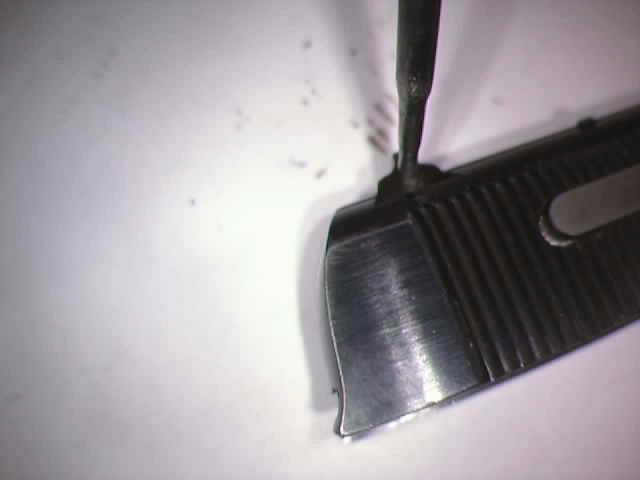 Con un botador desplazamos hacia la izquierda la mira, no hace falta quitarla del todo, solo hasta que se vea completamente el pasador de la aguja percutora.