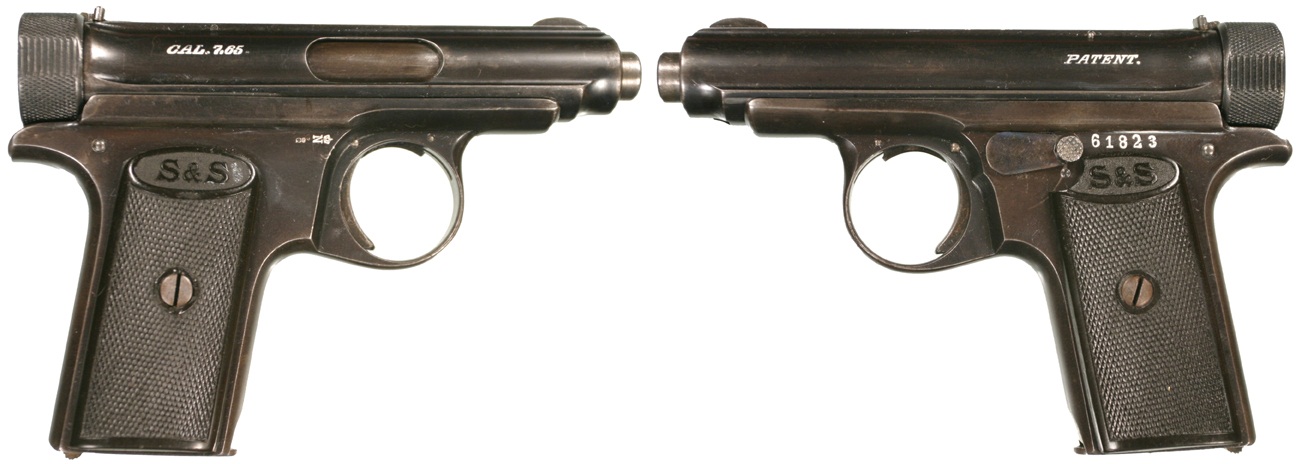 Es una Sauer&Sohn en 7,65 mm sin duda, pero esas cachas, la ausencia de mira trasera y ese pasador bajo la palanca del seguro la hacen muy especial y la convierten en una de las rarísima S&S Modelo 1913 de la 1ª Variante y Subvariación A.