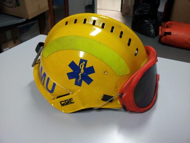 El casco en cuestion es el que se usa para rescates e intervenciones en incendios forestales ,tambien lo he visto en algunas unidades del SAMUR.