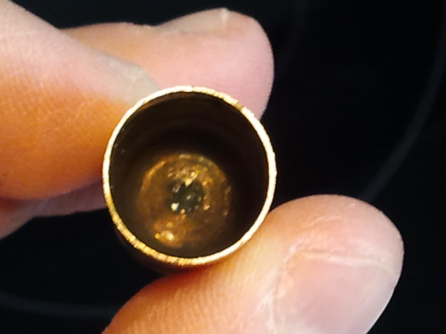 Y por último una vista del interior de la vaina, en el que se observa el canal de combustión por el que pasa la ignición originada por la percusión y detonación de la carga explosiva del pistón, la cual a su vez provoca la ignición de la pólvora contenida en la vaina (seguro que me he expresado como "salva sea la parte" [ o, lo que es lo mismo, como el culo ] , pero le he puesto mi mejor intención y el mayor de mis empeños; así que si está mal, me corregís y punto, que mi única neurona no da para más
