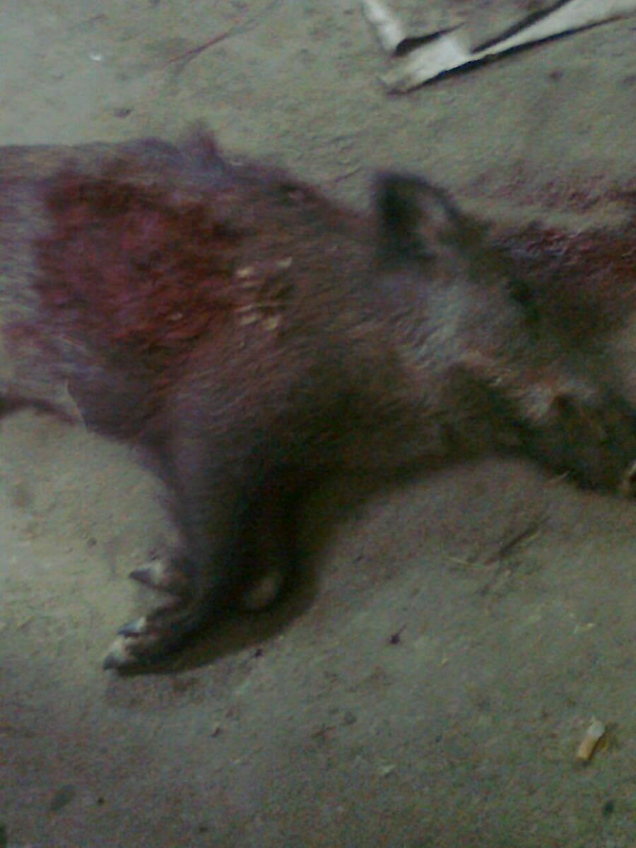 Hasta que el viernes le dije a la parienta que no me esperara hasta las 2 o las 3 de la mañana hasta que me entrara el jabalí. Cual fue mi sorpresa que a las 11, 15 de la noche lo sentí como entraba al cebadero y como comenzaba a comer. Le dejé comer varios minutos hasta que decidí dispararle, no había nada de luz por tanto encendí la linterna y disparé. El jabali salió corriendo y a unos 10 metros se desplomó muerto pesaba 70 kg y tenía buenos comillos