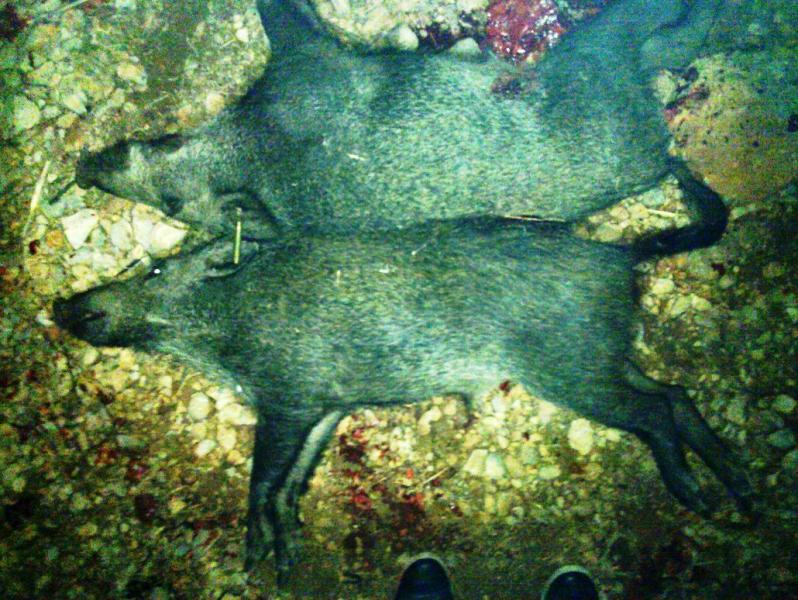 Tomo tranquilamente la linterna y el fusil; camino hasta el lugar y encuentro yacentes dos bonitos machos, uno junto al otro. En efecto, tal y como me lo propuse, el de delante tenía el orificio medio palmo tras el codillo y, el segundo, el pleno codillo. Aunque ambos murieron instantáneamente (no emitieron sonido alguno ni patearon, cosa que a mi me llena siempre de lástima y por la que siempre me apresuro a hacer un buen disparo de gracia), el de detrás se llevó la peor parte, pues recibió el proyectil Barnes TSX de 235 grains ya abierto. Creo que si hubiese habido 6 u 8 gorrinos en fila todos habrían sucumbido de igual modo.