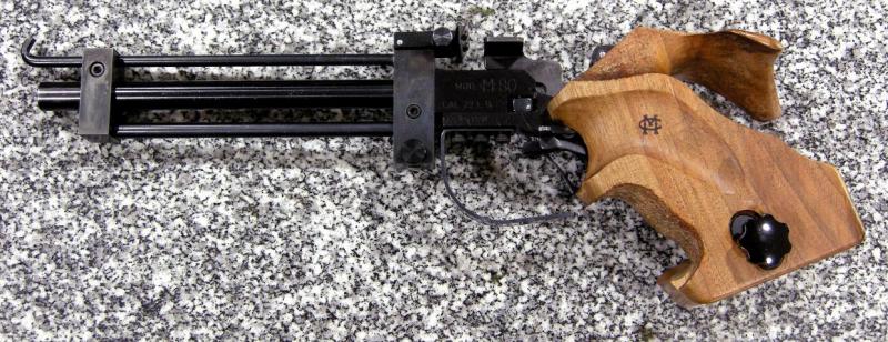 Tiene una cosa en su diseño curiosa y creo que única. Su empuñadura obviamente es una estupenda Morini anatómica envolvente y ajustable (también en ángulo). Las empuñaduras anatómicas fueron lo primero que se puso a fabricar el señor Morini allá por el año 1.973, y Hammerli uno de sus primeros clientes. El disparador es mecánico y muy sensible, ajustable entre 5 y 20 gramos. Lo curioso de esta arma es su sistema de puntería. Tanto el alza como el punto de mira están situados sobre unos bloques que abrazan el cañón de la pistola y que pueden ser girados 360º a un lado u otro y desplazados a lo largo del cañón de la pistola hacia adelante y hacia atrás. En la parte inferior del bloque del alza se inserta asimismo una barra a modo de contrapeso a la que se le pueden añadir más pesos circulares móviles en forma d aro. En cuanto al punto de mira, este puede ser de dos maneras. En una de ellas el punto de mira es una barra que se inserta en la parte superior del bloque que abraza al cañón en su extremo anterior. Esta barra también puede ser girada a un lado u otro y desplazada hacia adelante y hacia atrás, con lo que varia mucho la longitud de la linea de miras. El punto de mira en si no es más que el extremo de esa barra doblado hacia arriba. En la otra versión, la pistola tiene sujeto a la parte anterior del cañón un tubo con el punto de mira situado sobre él que también puede ser girado a un lado u otro y desplazado hacia adelante y hacia atrás.