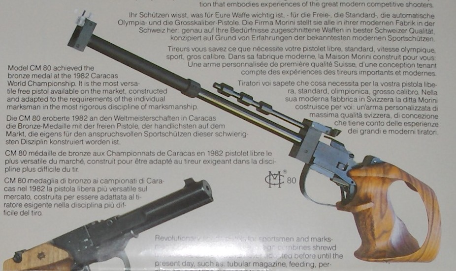Siempre me pregunté, al contemplar este arma, si el hecho de tener tanto el alza como el punto de mira adelantados respecto a la mano del tirador es ventajoso. Lo digo por aquello de que los dos elementos de puntería están en el "mismo brazo" de la balanza y no uno a cada lado, ya que el eje de giro (la muñeca) está más atrás. ¿Qué opináis los expertos? Va una foto del catálogo de la época.
