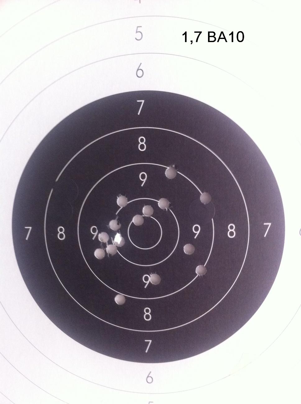 Las pruebas con 1,7 empiezan a estar bien pero no para un tirador de tu nivel por otros blancos tuyos que he visto. Por otra parte 1,7 de ba10 es ya una carga peligrosa para mi gusto. De todas formas sin esperimentar es dificil mejorar.Un saludo