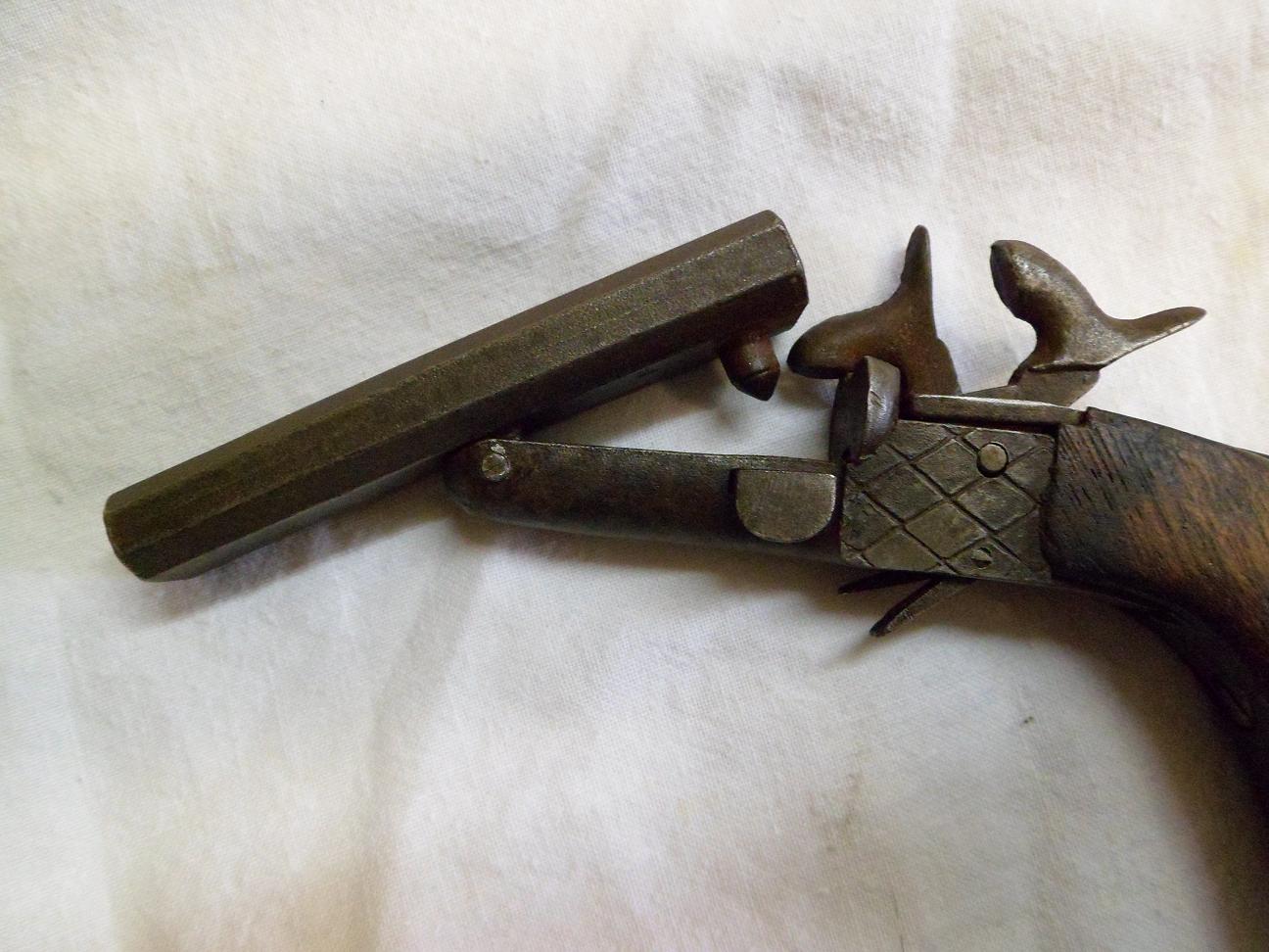 Así, a ojo, mi apuesta sería por una pistola de dos cañones de retrocarga, de sistema Lefaucheaux (alias "cartuchos de espiga"). Creo que en el siglo XIX las solían llevar los viajeros, comerciantes ambulantes, tratantes de ganado...