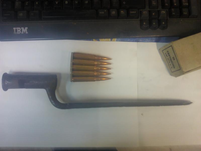 Hablando de pinchos y desvirtuando un poco el tema , a ver quien me puede indentificar esta bayoneta , debe de andar por finales de 1700 principios de 1800 posiblemente de la Guerra de Independencia (o del frances). Yo creo que es de un fusil ingles Tower o Brown Bess pero la veo demasiado corta. Los cartuchos de referencia son 7.92