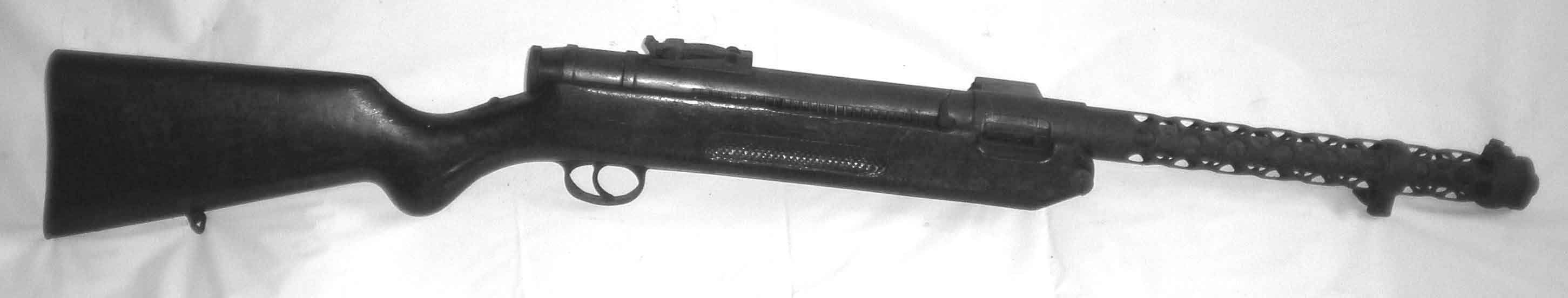 tenia un cargador de 50 cartuchos y la palanca de montar era en forma de gancho como el Bergmann MP-28