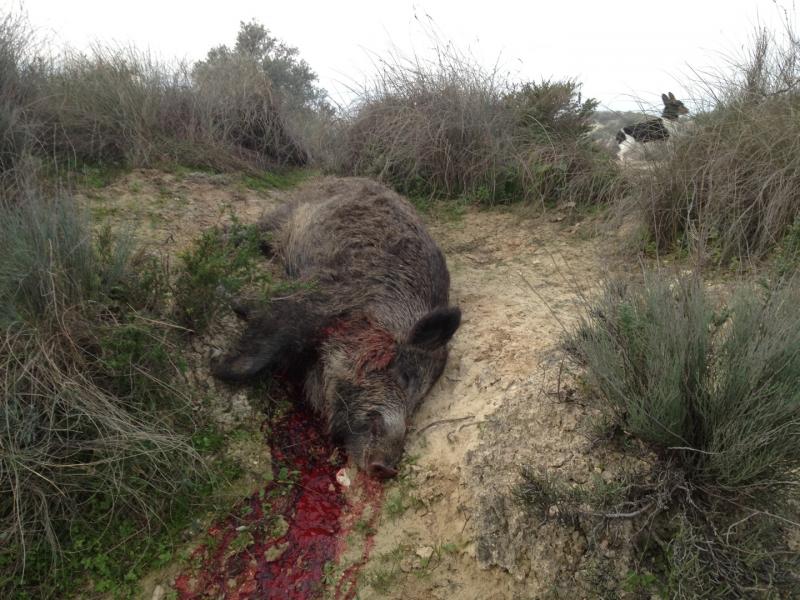 Volví a mirar a través de los prismáticos y, cuando a aprecié que la hembra (sabía que era una hembra, no hubo error) estaba algo apartada, eché rápidamente mano al rifle, apunté y encendí la luz. La marrana inició un trotecillo para irse, pero adelanté un poco el tiro y cayó fulminada sin mover un pelo. Ahí terminó todo.