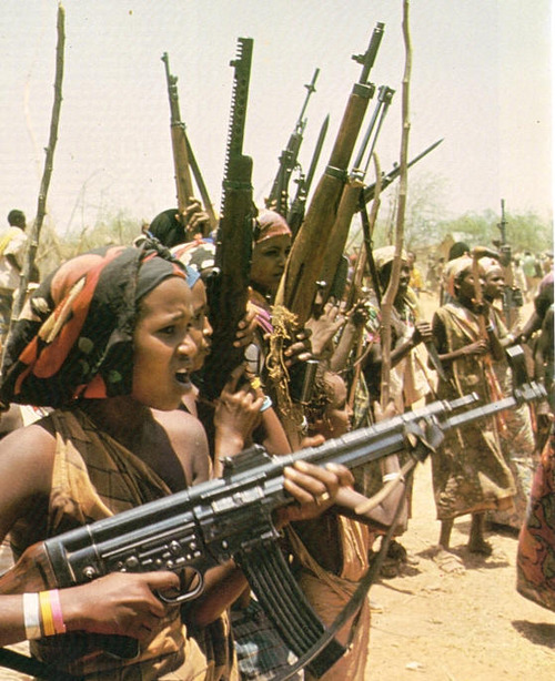 En la del pupurrí ese de armas que empuñan estos somalies en la decada de los 60-70 vemos entre ootras cosas, en primera plana al StG44 y tras el dos fusiles que no puedo identificar, luego se ve un carcano con bayoneta plegable y mas atras un mauser por ahi rondando, y palos tambien por cierto, muchos palos