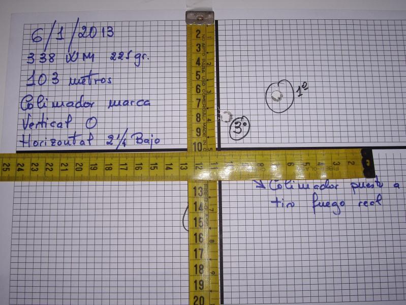 Yogi, efectivamente tienes razón, cuando ponía a tiro el 30-06 de cerrojo que tenía, hacía grupos de 3 porque agrupaba en un diámetro inferior a este, en un diámetro de unos 6cm. Pero esta tarde, al comenzar la tanda, tiré dos veces de 3 en 3, y me los metía en línea, más o menos, por lo que al final, sólo tiraba de 2 en 2 (tiré 21 disparos).