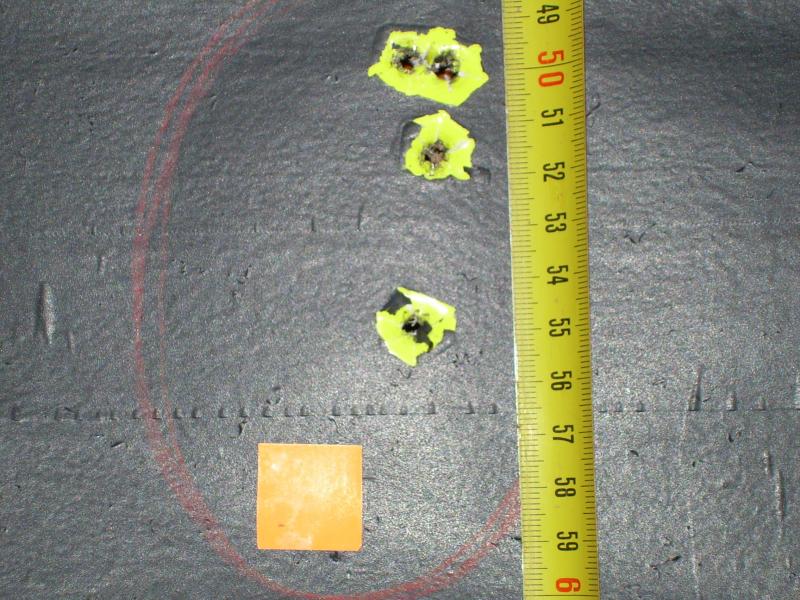 Hoy por la mañana, rifle FN Zénith BG 9,3x62, distancia 100m, apoyo en banco de tiro, el impacto de abajo en la segunda foto es el primer disparo con el cañón limpio y frio, los demás tiros dejando un minuto entre tiro y tiro hasta completar los 3 y después dejando otros 5 minutos hasta la siguiente tanda