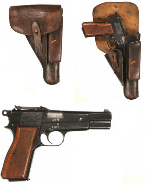 Yo diría que el primero lleva una P 38 y el 3º una FN HP 35. Me parece que el grosor del bolsillo para el cargador extra es mayor en el 3º, que puede coincidir con la HP 35.