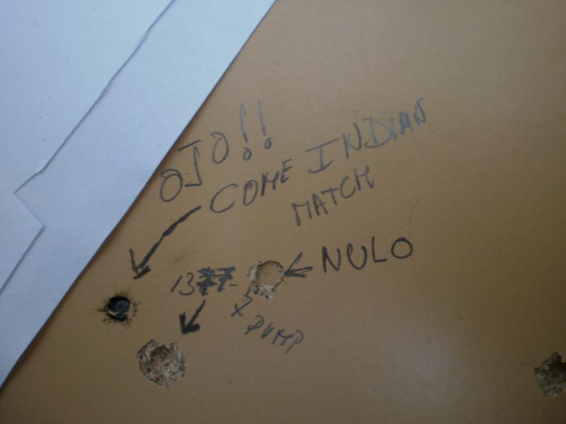Bueno, realizar esas pruebas sobre tablero a solo 4 metros no es algo que sea para recomendar, si por “cochina” curiosidad quieres conocer el factor penetración te recomiendo mejor el taco de jabón o de plastilina y si quieres ser “sibarita” fabrícate un mini túnel de tablas de pino... bueno -para aire- mejor de tablillas de cajón de frutas.