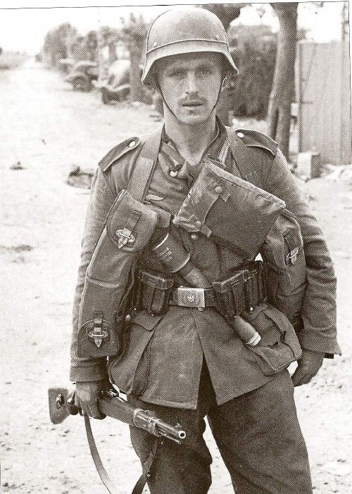 Aqui un miembro del equipo de ametralladora Solothurn, en Dunkerque, con las bolsas portacargadores.