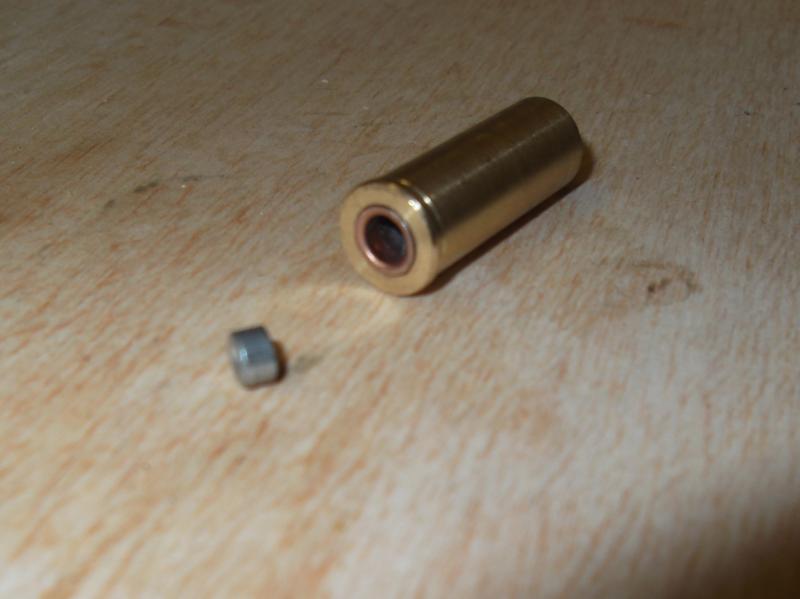 Al preparar el cartucho de nuevo, primera historia a la hora de sacar el piston, se necesita un botador, pouch le llaman en ingles para sacarlo de su cabidad, el más fino que hay, dado que el canal es pequeñisimo, pero eso significa que el piston se desmonta, con lo que hay que sacarlo con un poco que inclinación. Seguidamente pongo la bolita de plomo de .440, me fijo que estas encajan a la primera, dejando la mitad dentro y la otra mitad fuera, y no cayendo por su propio peso al voltear el cartucho. Me pongo a unos 10 metros del objetivo y bum!!!