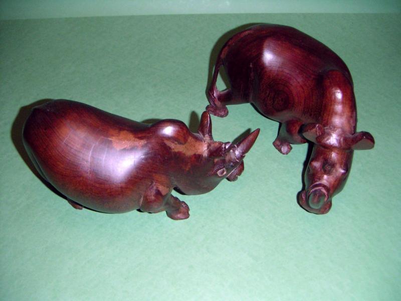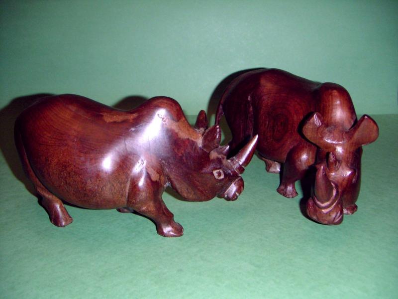 Figuras; Esculpidas en madera semi-preciosa de Pau-rosa, taller de arte popular Chuabo, aldea de Nicoadala - Zambezia (Mozambique). Representando dos Rinocerontes enfrentados.