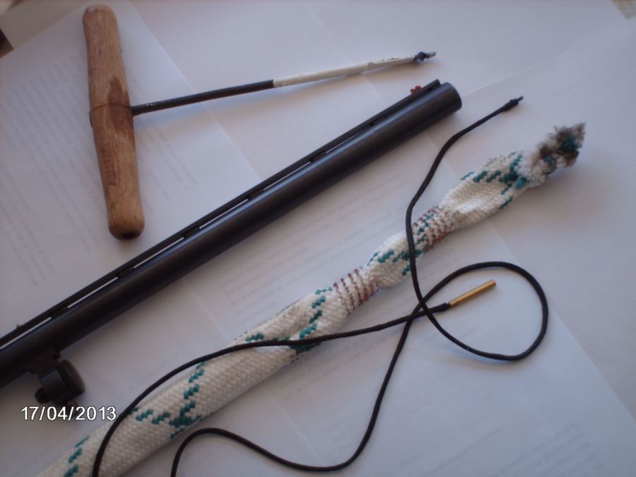 Hoy limpiando el cañón de mi Mossberg 500, he puesto un poco de aceite WD-40 y he pasado el cordel desde la recamara a la boca de fuego he ido tirando de el pero se ha desprendido la cuerda quedando el "snake" dentro del cañón (sin sobresalir por ninguno de los dos lados) ha quedado a unas 9 cm de la recamara y unos 13 de la boca de fuego.