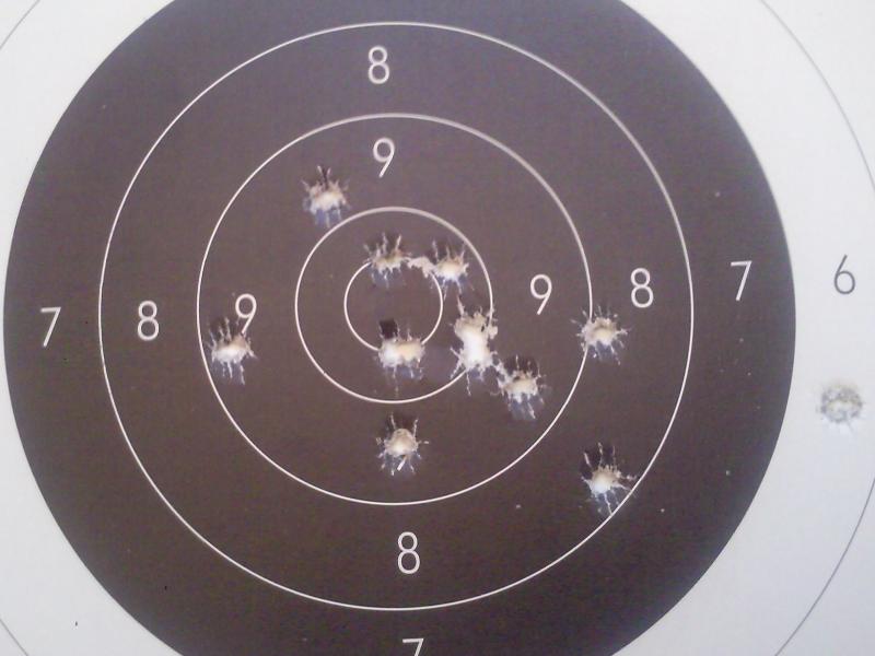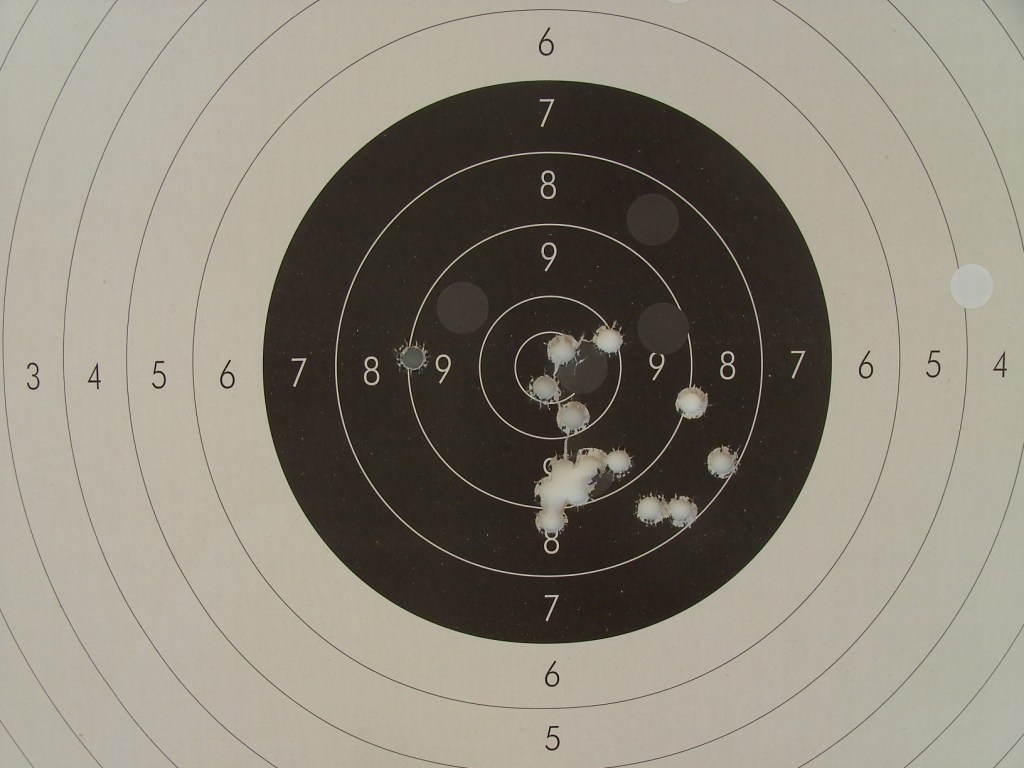 Aunque se mezclan los dieces con una agrupación interesante en el nueve, también detecto los disparos malos ya que de momento no me hago con la correa y la posición del arma (no se me queda clavada como el Gibs). Tampoco sufro del "síndrome del Sharp" y mi ceja sigue ilesa, pero noto ligeras oscilaciones (en el eje 11-4) que no soy capaz de controlar a pesar de algunos cambios en la posición de la correa.