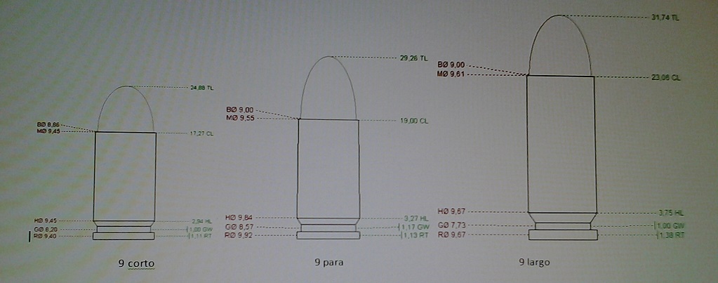 Acabo de medir el culote y el comienzo del cuerpo o faldón de las vainas del 9L, 7,63 Mauser y 7,65 Parabellum y son los siguientes: