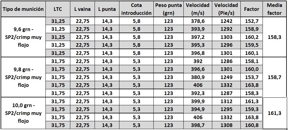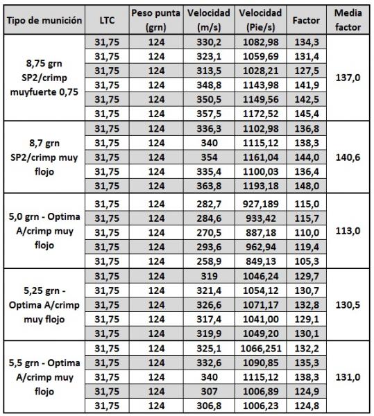 Para aquellos que sois novatos como yo, os dejo parte de mis tablas de recarga a modo de comparativa para que tengais una referéncia. El arma usada es una SPS 38 Super con freno de boca NO híbrido.