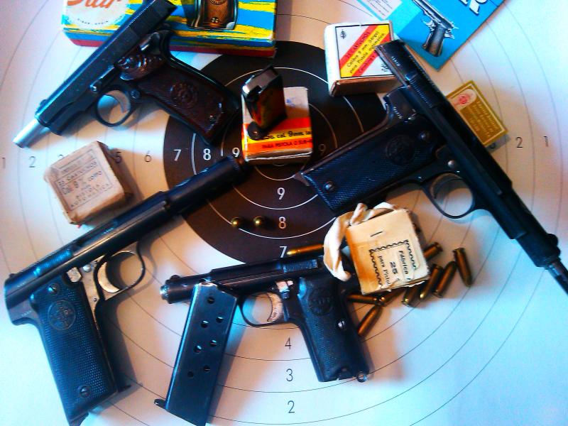 Arriba a la izquierda,1/ pistola " AK " Garnica, con marcados " GN " de Garate y Anitua.2/ Pistola " RH" Retolaza Hermanos.3/ Astra 300 380 acp . 4/Revolver copia S*W military de "OH" en 8 mm 1892 para Francia.
