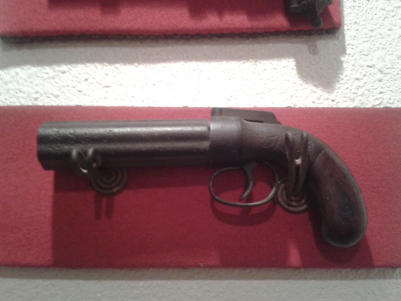 Bueno, la primera es un "Pepperbox" que en España se llamaban Cachorrillos ó Avisperos. Es uno de los ancestros de los revólveres.Intenta buscarle los cuños del armero.Si son de Lieja, Lóndres ó USA, puede ser una buena pieza, los hacían también en Eibar (Un cuño de un escudo con casco de armadura y una "X" en el centro) pero eran muy malos. Naturálmente, sólo funcionaban con Pólvora Negra, bala de Avancarga y pistones en las chimeneas.Para cargarlo, hay que soltar los cañones. Comprueba siempre que el arma no esté ya cargada, que era lo habitual cuando las guardaban en casa...A mi, con una Carabina Minié Belga de la IIIª Carlistada, desmontando la culata del cañón en mi taller en S.S., se me ocurrió calentarle la rosca con un soplete...¡Casi tiro un tabique...!