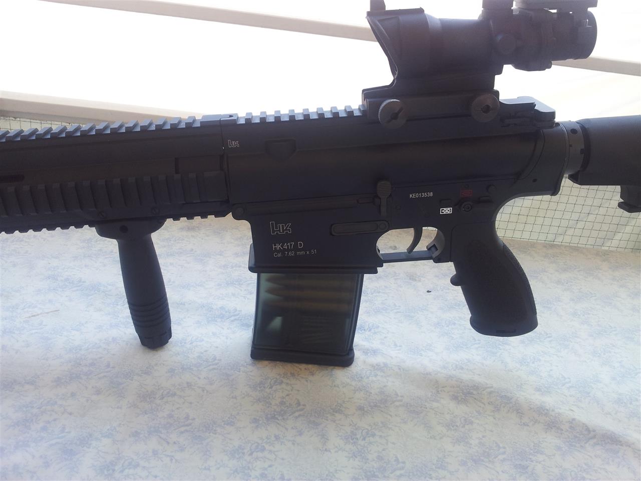 Pues aqui les dejo unas fotos de mi última adquisición airsoftoril un HK417 al que le he puesto un visor ACOG4x + Micro Red Dot , Grip Vertical y silenciador. A ver que les parece.