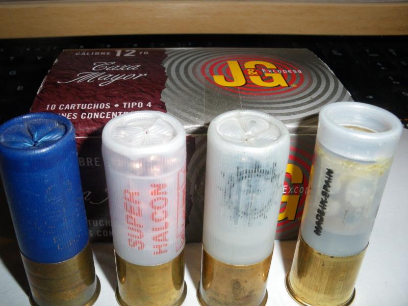 Los cuatro cartuchos son de boliches el de la derecha es el JG y viene embutido en cera o algo así.