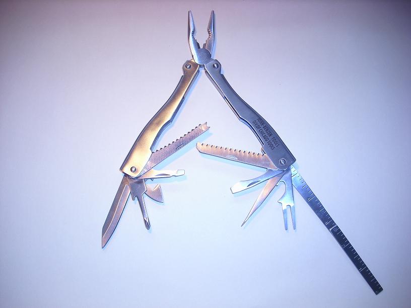 Con navaja, sierras, destornillador plano, de estrella, abrebotellas, latas, metro (hasta 13 centímetros, pulgadas) pincho, corta alambres, tenedor, ...)