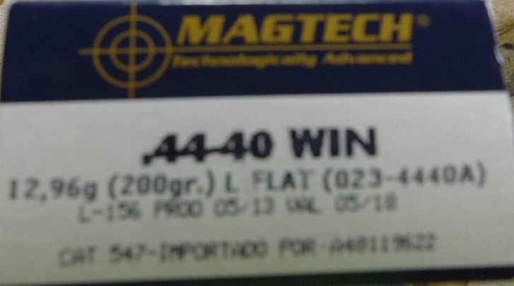 Hola, siento contradecirte, pero tengo en este momento en mis manos una caja de Magtech del 44-40 WCF y en ella, en la parte de atrás, pone una tabla en donde dice que la munición 44-40 Win tiene una punta de 200 grains y da en la boca una velocidad de 360 m/s (1180 pies por segundo) y una energia de 840 Julios (619 ft-lbs)