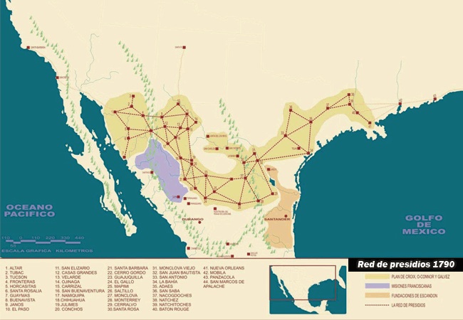En 1771 se estableció definitivamente una línea de 13 presidios desde Altar, en Sonora, hasta Espíritu Santo, en Tejas. Al norte de esta línea quedaban dos puntas de lanza en mitad del territorio salvaje: Santa Fe, en Nuevo Méjico, y San Antonio de Béjar, en Tejas. El mantenimiento de la frontera con tan escasos efectivos fue posible gracias a la colaboración de los nativos. Los españoles eran una minoría representada principalmente por los soldados, los misioneros y los cargos administrativos, aparte de un pequeño número de colonos establecidos en ranchos o diseminados por las poblaciones, mientras la mayoría de la población la componían los indios amigos. En tiempos de guerra se reclutaban unidades auxiliares de entre las tribus, aparte de los exploradores que servían permanentemente en el ejército. Hasta finales del siglo XVII la convivencia fue difícil, salpicada de conflictos e incluso grandes revueltas como la de los indios pueblo en 1680, pero a partir del siglo XVIII la mayoría de las tribus que habitaban en los dominios españoles se sometieron sin problemas. Este cambio de actitud se debió al surgimiento de una nueva amenaza tanto para unos como para otros. Muchas tribus de nómadas de las grandes llanuras del norte emigraron hacia regiones más meridionales, empujados en parte por la colonización británica y francesa de la costa este. Estos pueblos se convirtieron en incursores dedicados a saquear los poblados de las tribus del sur. Ante estos temibles enemigos, los indios del virreinato aceptaron la dominación a cambio de la protección del ejército español.