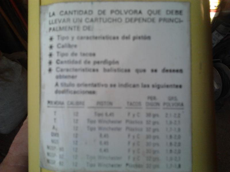 Munchas gracias muchachos , entonces no habria problema en utilizar a polvora no?. Por supuesto asegurando antes las cargas que le correspondan. Mañana lo compruebo pero creo que hay bastante diferencia entre la tabla de la lata y una tabla que publico remigton597 en la pagina 99.