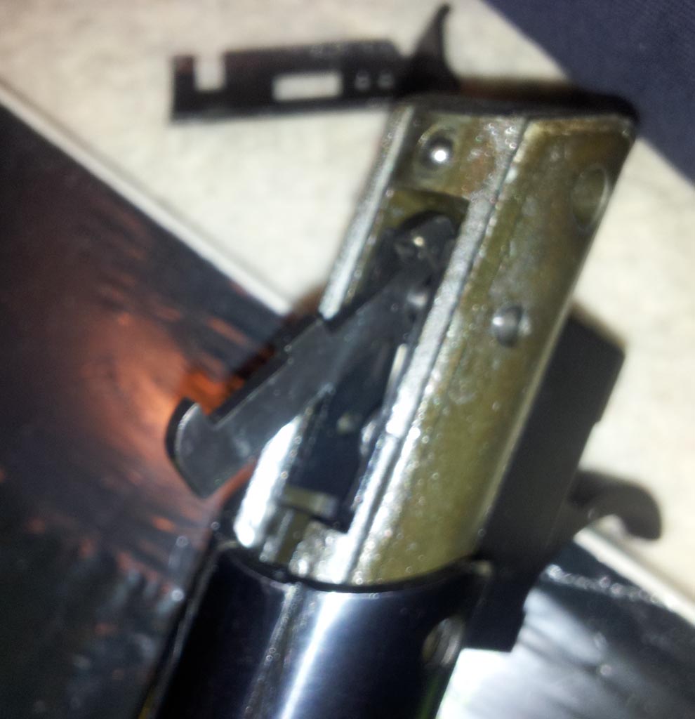Hay un saliente de la pieza que señalo con la flecha en rojo que en la foto que pones de tu carabina no se ve (pongo tambien tu foto girada para comparar). Supongo que deberías mover la pieza para que se quede hacia arriba el saliente, como en la foto que te pongo, y así encajaría en el hueco al poner la pletina. Creo que puedes moverla directamente sin ningún problema (me parece que no hace falta mover el gatillo ni nada más).