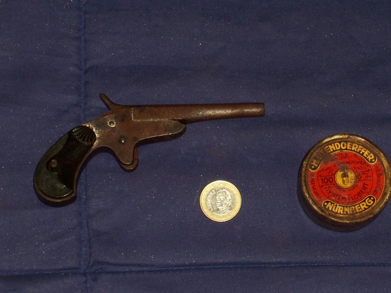 A mí me parece una pistolita monotiro del calibre 6 mm Flobert. Compañeros más expertos podrán decir más cosas a partir de los punzones...