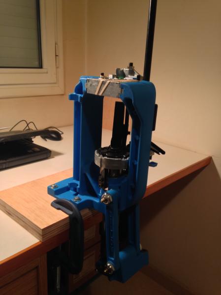 Una vez ensamblada la Dillon a esta base con los pernos, ya podemos ponerla encima de la mesa sujetándola con dos mordazas bien gordas.