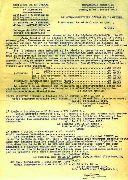 Volviendo por un momento al tema de las Ruby y las Star 1914 reglamentarias francesas encontré por ahí este interesante documento de 1915 en el que se hace referencia a ellas.