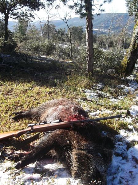 Se ha cumplido y se ha dejado cumplir ... y sin embargo hacia sol.. un dia helador,, con capa brillante en la carretera que acojonaba a sargento legionario.. !! Esta semana he ido a tres cacerias, y hoy por fin ha sonado el cañon del Remmington.. Hacia frio si, era pronto,, apenas media hora en el puesto,,.. Cayo noble y limpiamente este animal,, cumpliendo con su estirpe ,, fugaz se desvanecia entre las encinas, encontrandose con una Interlock en vuelo rasante de 11 gramos , que dio al traste con cochinero trote.,, exhalo sus ultimos alientos ,, delatando su posicion detras de una joven encina,, con el sol de la mañana de frente.