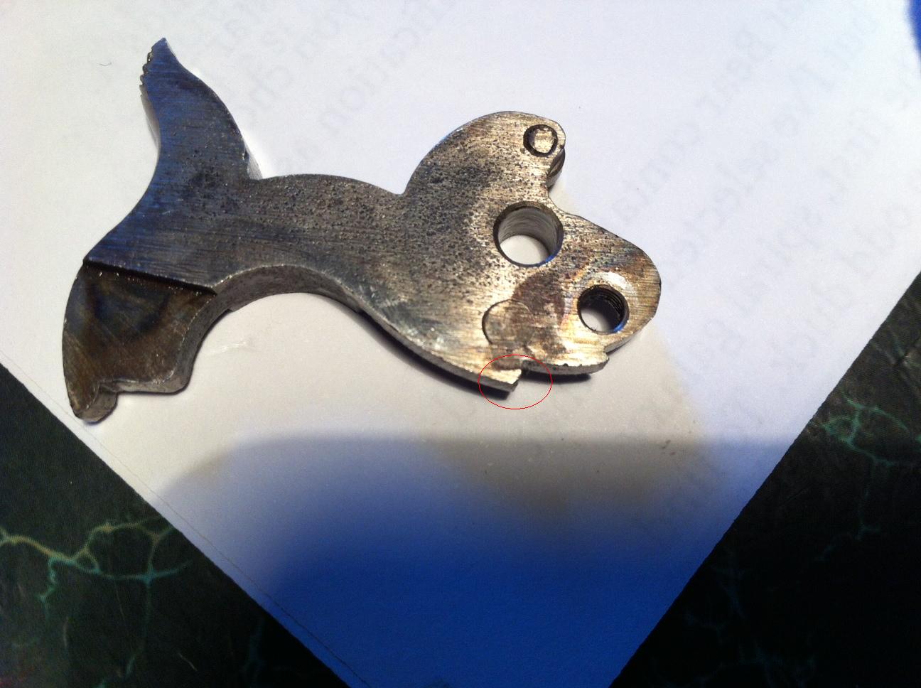 Al final me puse a desmontar el pocket (encomendándome a todos los Santos...) y descubri exactamente lo que me decía Orión. La primera muesca del martillo (la correspondiente al anclaje en posicion de seguro) estaba medianamente desgastada. Intento poner una foto de como se encontraba.