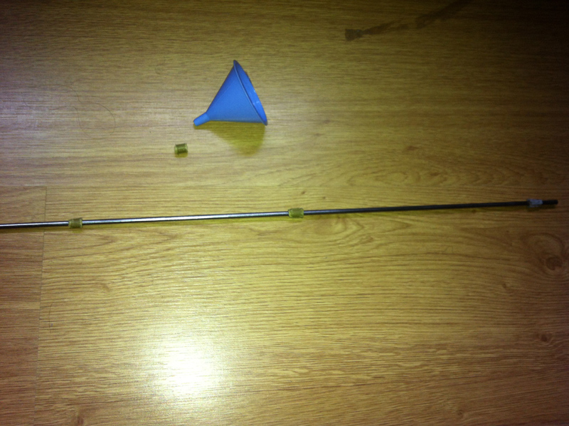 - Metemos la varilla, ya con los tacos/separadores puestos, con cuidado de no rascar el ánima acero con acero para no arañarla, mejor con el embudo puesto para centrarla.