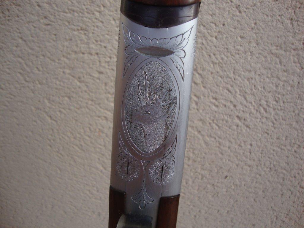Superpuesta alemana marca Neckerman en calibre 16/70. Escopeta expulsora y monogatillo con cañones de 70,5 cm de 3 y 1 estrellas respectivamente, probados a 1450 kg. Punto de mira de fibra óptica en rojo. Inmejorable estado de maderas y pavon como se puede ver en las fotos. Ningún fallo mecanico, ni la mas minima holgura. Arma muy robusta y fiable. Pletina entera con bonitos grabados de escenas de caza.