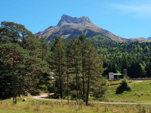 De aquí hacia arriba el coche ronronea trepando por la pista y paramos un instante para contemplar desde Pradolamina y ya a nuestra espalda la primera mole que hemos atravesado por la angosta carretera de las Bocas del Infierno, colgada sobre el río encajonado... Peñaforca.