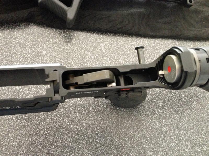 Podemos ver que el disparador es mucho más complejo que el de un AR convencional, lleva un seguro para retener el martillo y una placa para proteger la retenida. Además el diseño permite meter el seguro en cualquier posición del cierre, este el martillo montado o no.