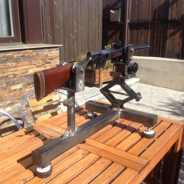 Pues este es el mio. Por unos treinta euros en materiales y un amigo con una maquina de soldar. Yo creo que es importante el peso, el mio pesa unos 25 kilos y eso hace que que a la hora de mover las torretas del visor apuntado ni se mueva. El sistema de las patas esta pensado para poder tirar desde una mesa o cualquier sitio irregular como el capo de un coche. Las patas se pueden anclar a una mesa metálica, pero me gusta mas como esta en las fotos pues mas manejable.