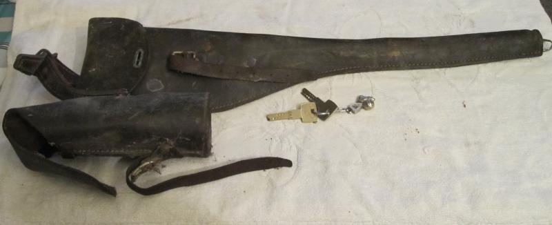 primero pare ser una funda militar para un revolver, no se que ejercito pero el cilindro de al lado podria ser para llevar los tambores cargados , de polvora negra.