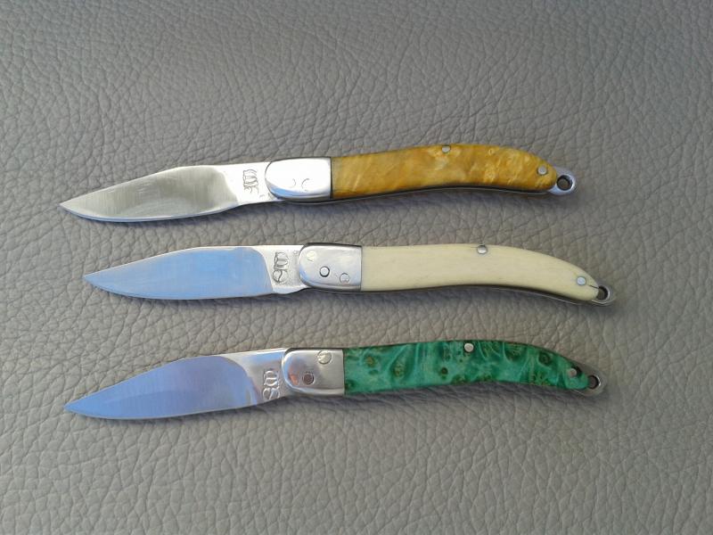 Estan realizadas en acero Ma5mv. y las cachas, una de hueso de camello y dos de ellas de madera estabilizada.